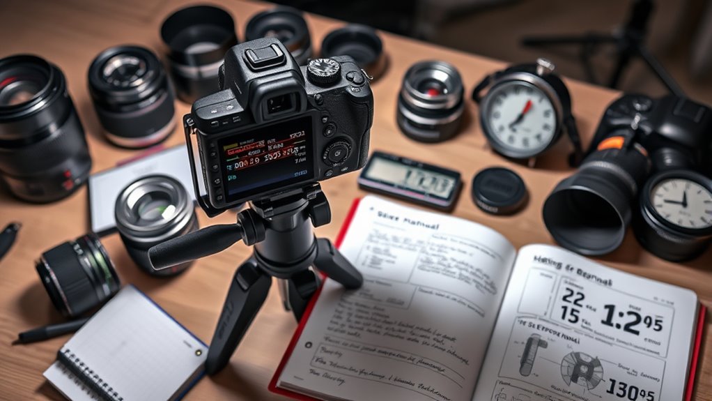 Developing a routine for ongoing exposure management skills is essential to keep your footage consistent and professional over time. Regular practice helps you anticipate how exposure adjustments affect film grain and color grading, ensuring cohesive results. To stay sharp, consider:
