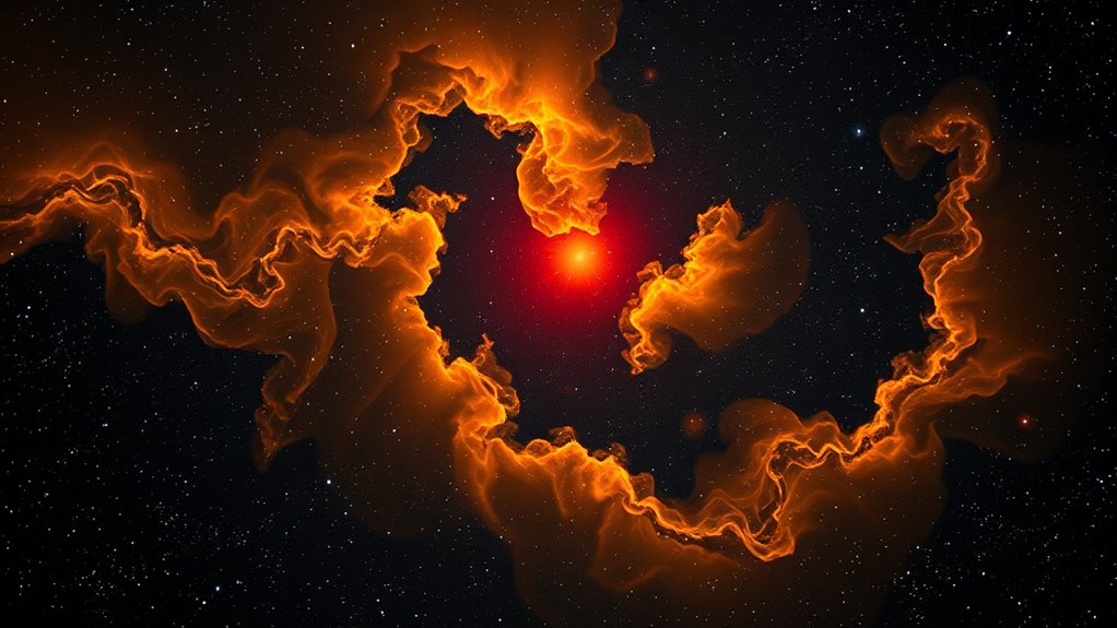 The nebula’s chemistry plays a vital role in star formation processes by providing the essential elements like hydrogen, helium, and dust. When these materials condense under gravity, they form new stars. Rich chemical compositions speed up star creation, while certain molecules can hinder the process. Understanding nebula chemistry helps you grasp how stars emerge and evolve within these cosmic nurseries, shaping the galaxy’s stellar population.