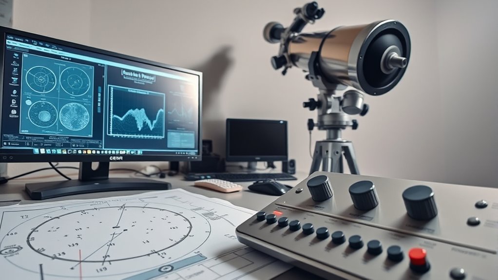 To effectively adjust for equipment latency, you need to account for the time it takes your gear to respond and stabilize during a meridian flip. This ensures smooth tracking accuracy and minimizes image shifts. First, perform sensor calibration to ensure your mount and camera are synchronized properly. Second, test your equipment’s response time by executing a few manual flips, observing how long it takes to regain stable tracking. Third, set your flip timeout slightly longer than this response time, allowing your system enough leeway to adjust without unnecessary delays. By doing so, you prevent premature flips or tracking errors, maintaining ideal sensor calibration and tracking accuracy throughout your session. Proper adjustment of equipment latency ultimately leads to clearer images and more reliable observations.