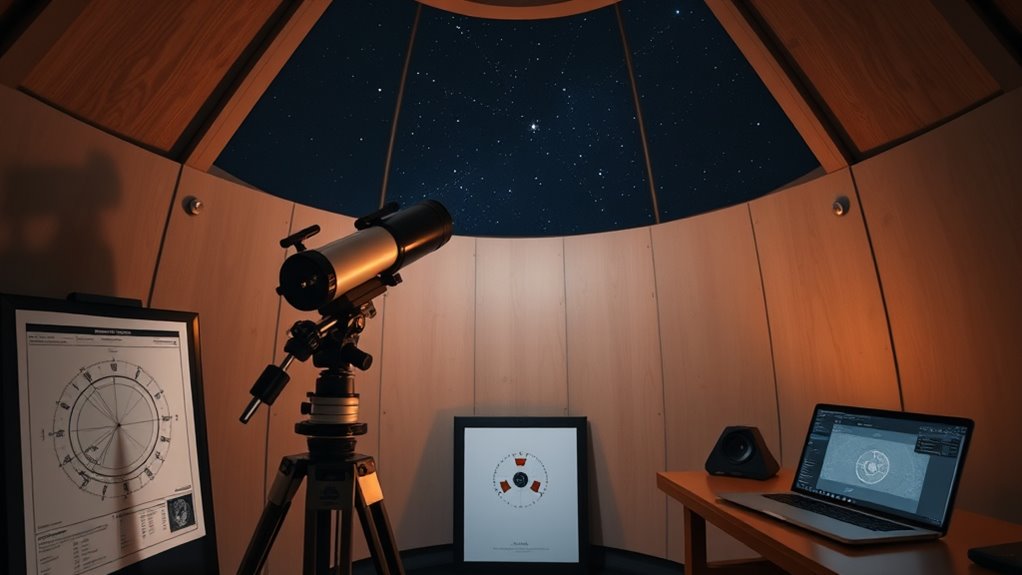 If your images appear blurry or streaked, it’s a sign of polar misalignment causing tracking errors. You might also notice objects drifting out of the field of view over time or star trails forming despite your efforts. These subtle clues hint that your polar alignment needs fine-tuning. Addressing these issues quickly guarantees your telescope tracks accurately, giving you crisp, clear astrophotos and enjoyable stargazing sessions.