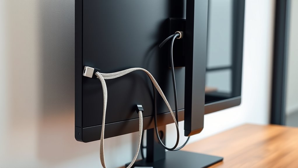 When selecting a desktop mount, understanding its cable needs is essential for a clean and efficient workspace. First, consider cable length selection to ensure your cables reach comfortably without excess slack, which can create clutter. Measure the distance from your device to the power source and peripherals to choose the right length. Additionally, cable color coding helps keep your setup organized. Using different colors for power, video, and data cables makes it easier to identify and manage connections quickly. Properly matching cable lengths prevents tangling and accidental disconnections, while color coding streamlines troubleshooting. Taking into account the variety of materials available can also influence durability and ease of maintenance. By paying attention to these cable needs, you create a tidy, functional workspace that minimizes distractions and maximizes productivity.
