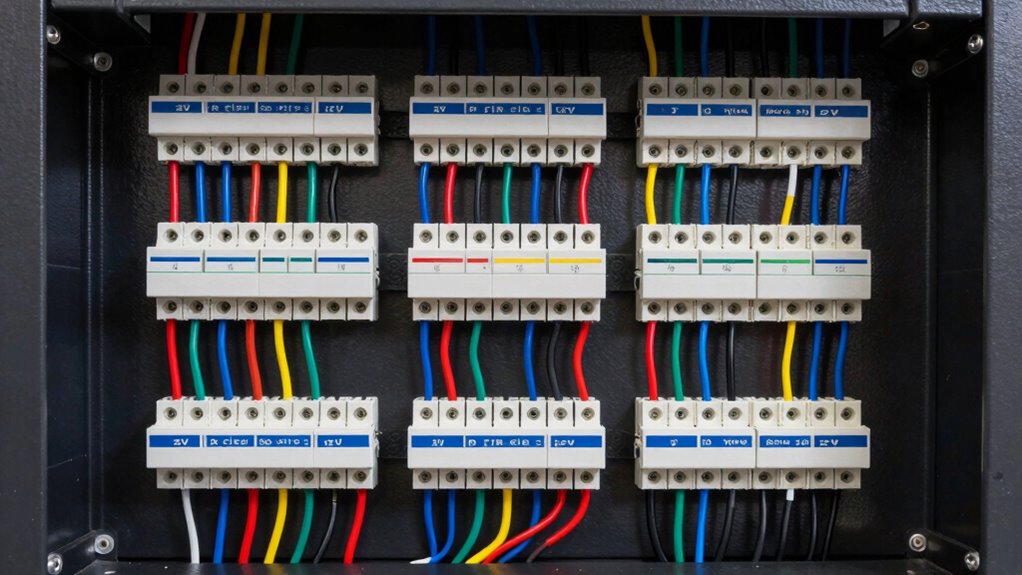 You should use clear connection labeling and color coding to keep your power connections organized. Label each connection with its purpose and voltage details, making troubleshooting easier. Use different colors for positive, negative, and ground wires to prevent mistakes. Consistently apply these labels and colors across your rig. This practice guarantees quick identification, reduces errors, and keeps your power distribution neat and efficient during setup and maintenance.
