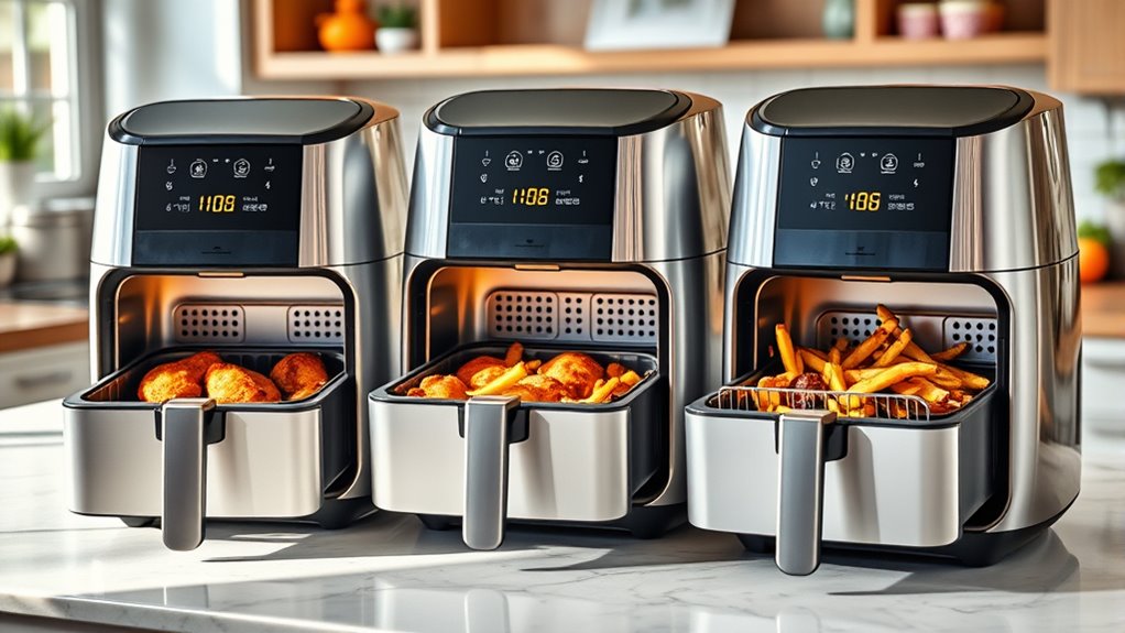 Ever wondered how quickly an air fryer can get dinner on the table for a large family? Speed is essential when cooking big meals, and some models excel here. Dual or multi-zone air fryers allow you to cook multiple dishes simultaneously, saving time. Higher wattage units, like those with 1700W or more, typically cook faster because they deliver more power. Features such as preheat functions and rapid air circulation technology can cut down overall cooking time, making meal prep more efficient. Multi-basket designs also help by preparing different components at once, though larger baskets may need slightly longer preheating and cooking. If you’re after quick meals for a big family, prioritize models with high wattage, multi-zone capabilities, and smart features that accelerate cooking speed.