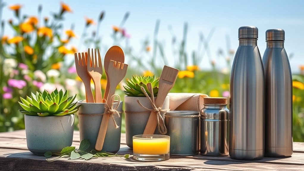 Practicality and usefulness are key factors when selecting eco-friendly gifts in 2025 because they guarantee the items will be genuinely valued and regularly used, reducing waste. Gifts made from durable, natural materials like bamboo or recycled plastics tend to last longer, increasing their practicality. Versatile items, such as multi-functional kitchen tools or storage solutions, enhance everyday utility. Reusable features, like refillable candles or rechargeable hand warmers, help minimize disposable waste. It’s also important to take into account the recipient’s lifestyle—choosing home essentials or personal care items they’ll actually use ensures the gift isn’t just eco-friendly but meaningful. When a gift is practical, it encourages repeated use, making it a sustainable choice that benefits both the planet and the recipient.