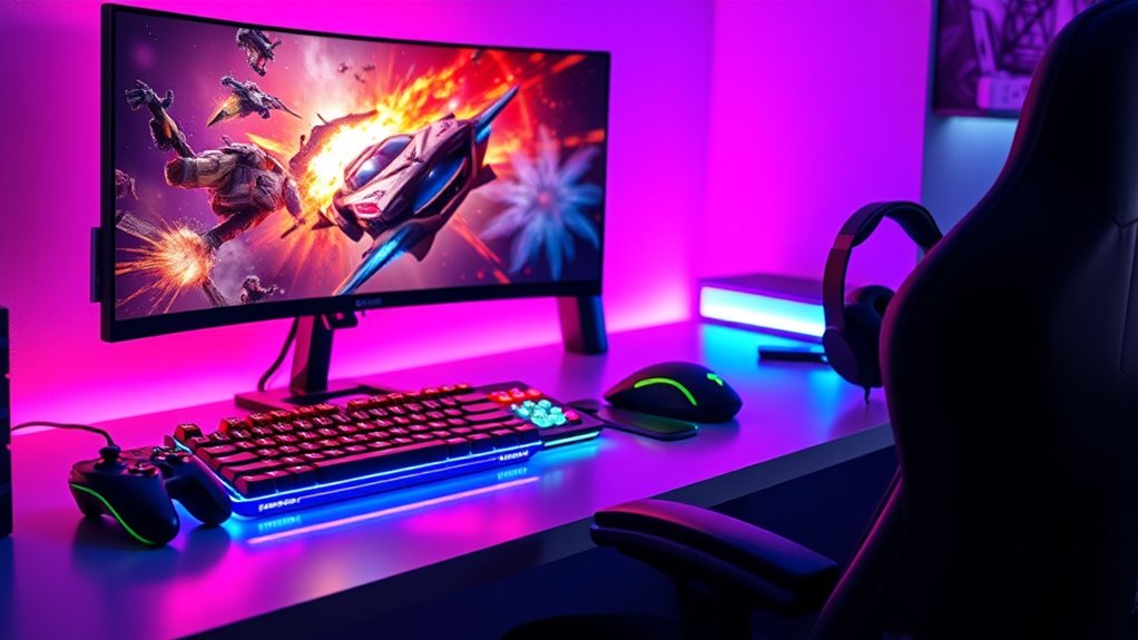 Ever wondered how to pick the perfect gaming gift? The key is understanding the recipient’s preferred genres, like action, RPG, FPS, or simulation. This helps guarantee the gift aligns with what they love most. Different genres often need specific hardware or accessories—such as racing wheels for driving games or VR headsets for immersive experiences. Knowing whether they game on console, PC, or mobile also guides your choices, whether it’s controllers, gaming chairs, or portable devices. Plus, popular genres influence merchandise options like themed apparel, collectibles, or decor that reflect their gaming style. Staying updated on trending genres and new releases in 2025 ensures your gift stays relevant and exciting, making their gaming experience even better.