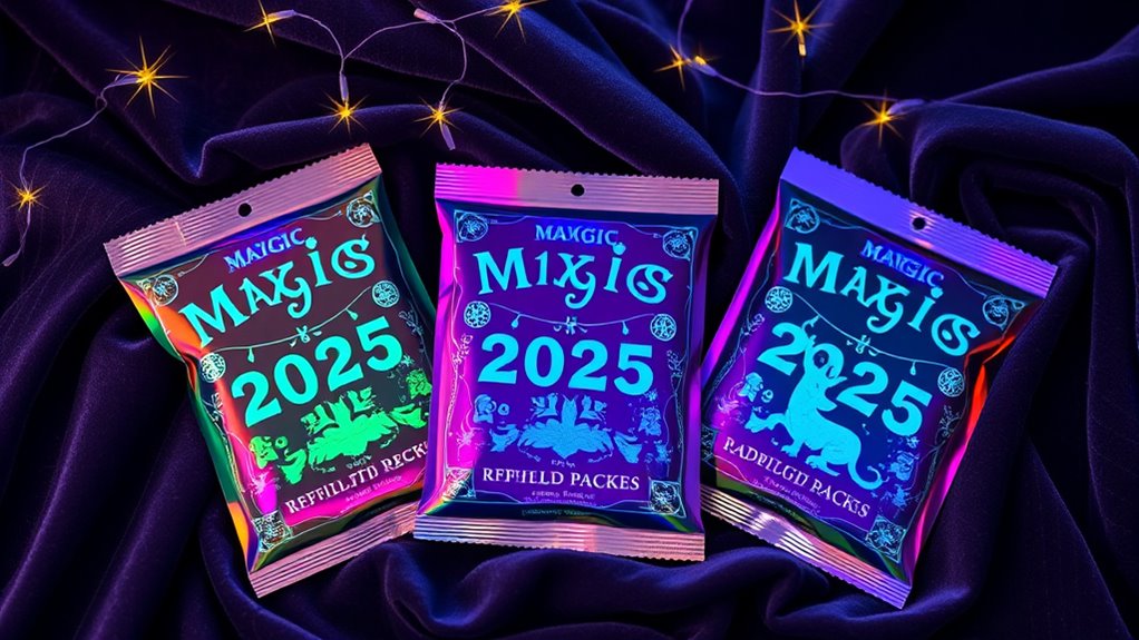 If you’re looking to complete your Magic Mixies 2025 collection, I recommend the Magic Mixies Pixlings Deluxe Pack, the Mixlings 2 Pack Cauldron with Magical Fizz, and the Magic Genie Lamp with plush toy and sounds. These refills add exciting new features, enhance magical play, and expand your collection’s possibilities. They’re compatible with existing sets and boost the enchantment. Keep exploring to find out more about how these packs can make your magic even more fun.