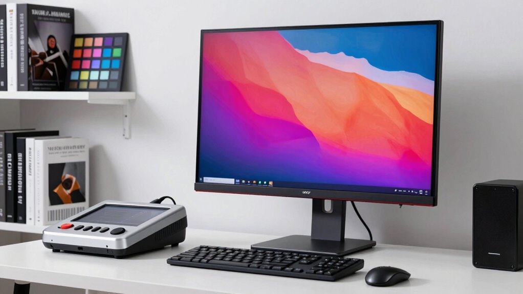 Choosing a monitor calibrator that matches your display technology is vital for achieving accurate colors, especially if you’re working with advanced screens like OLED or Mini LED. You need to guarantee the calibrator supports your specific display type, whether it’s OLED, LCD, or projection systems. It’s also essential to verify compatibility with your monitor’s size and resolution, including HDR-capable displays reaching up to 10,000 nits luminance. If you work with multiple screens, confirm the device can handle multi-monitor setups for consistent color accuracy across all displays. Additionally, check if the calibrator supports your operating system, whether Windows or Mac, for smooth integration. High-brightness displays like Apple XDR demand specialized hardware that can measure and profile professional-grade panels accurately.
