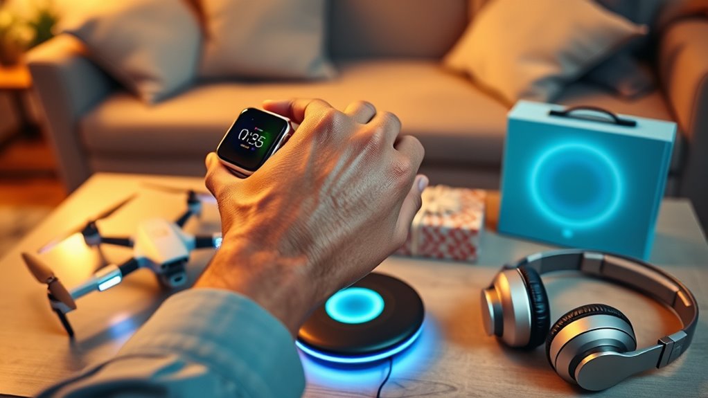 Setting a clear budget before shopping is essential to finding the right tech gift for dad in 2025. Knowing your price range helps narrow down options and prevents overspending. It’s helpful to contemplate the average prices of popular tech gifts this year to ensure your budget aligns with market values. Striking a balance between cost and quality is key; a slightly higher investment can mean better functionality and durability. Remember, gifts over $100 might require more planning, but budget-friendly options can still be practical and fun. Also, set aside extra funds for accessories, warranties, or support that can improve the overall experience. Being mindful of your budget ensures you get a great gift without unnecessary stress or expense.